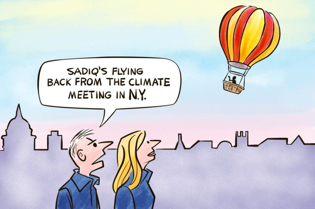 But Sadiq’s commitment to the environment is unwavering. Last week he was at a conference in New York on global warming, presumably he swam.